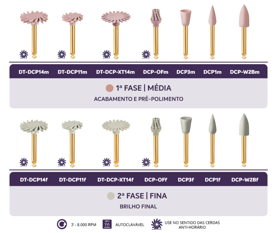 Com a primeira fase (rosa), é realizado o pré-polimento, enquanto a segunda fase (cinza) proporciona o brilho final. Os polidores Diacomp Plus Twist representam o que há de mais avançado em tecnologia para polimento de compósitos, oferecendo desempenho superior e excelente acabamento.