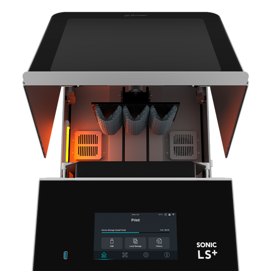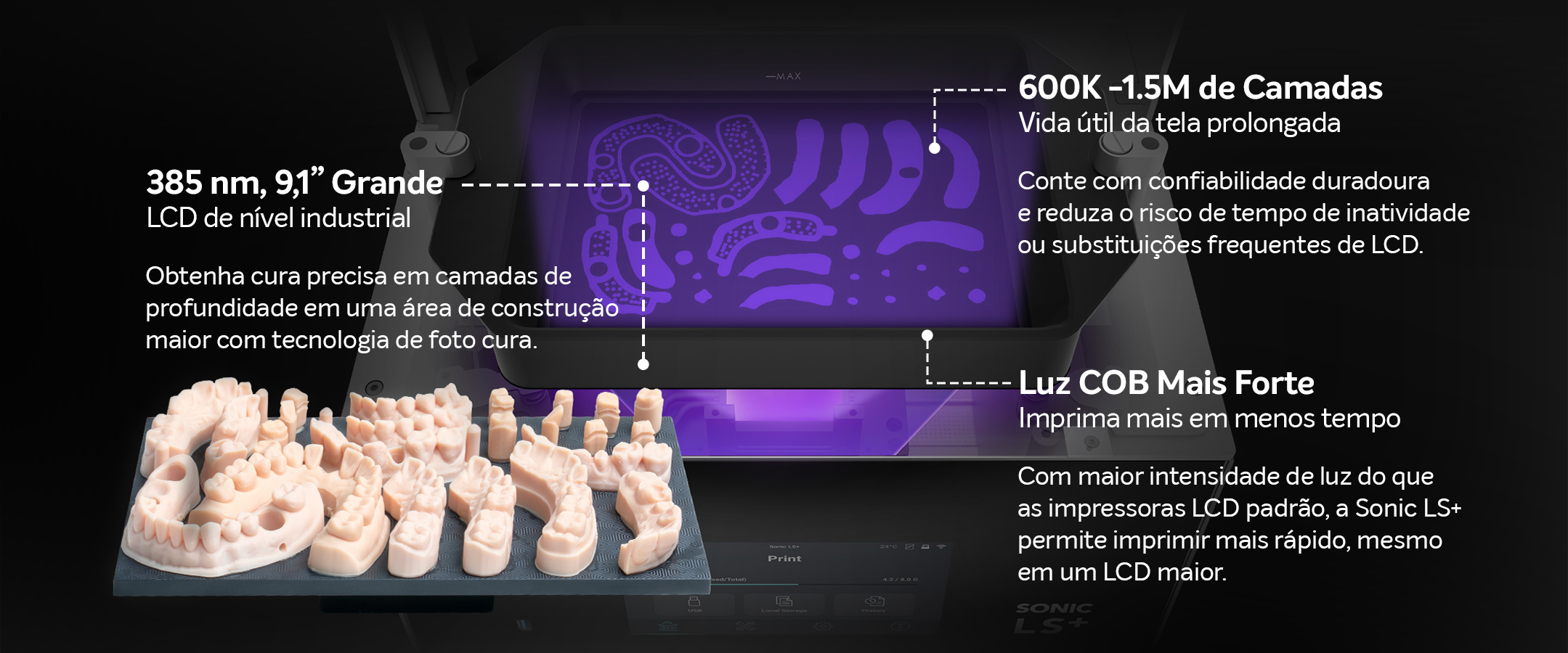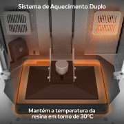 Sistema de aquecimento duplo: Aquecedor dedicado ao tanque de resina e à câmara de impressão, com temperatura controlada mantendo cerca de 30ºC durante todo o processo, assegurando condições ideais de impressão em qualquer estação do ano.