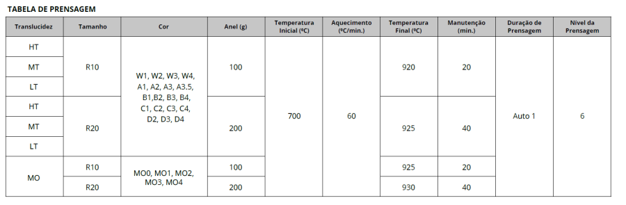 LT (Baixa translucidez) Cores: W1, W2, W3, W4, A1, A2, A3, A3.5, B1, B2, B3, B4, C1, C2, C3, C4, D2, D3, D4.